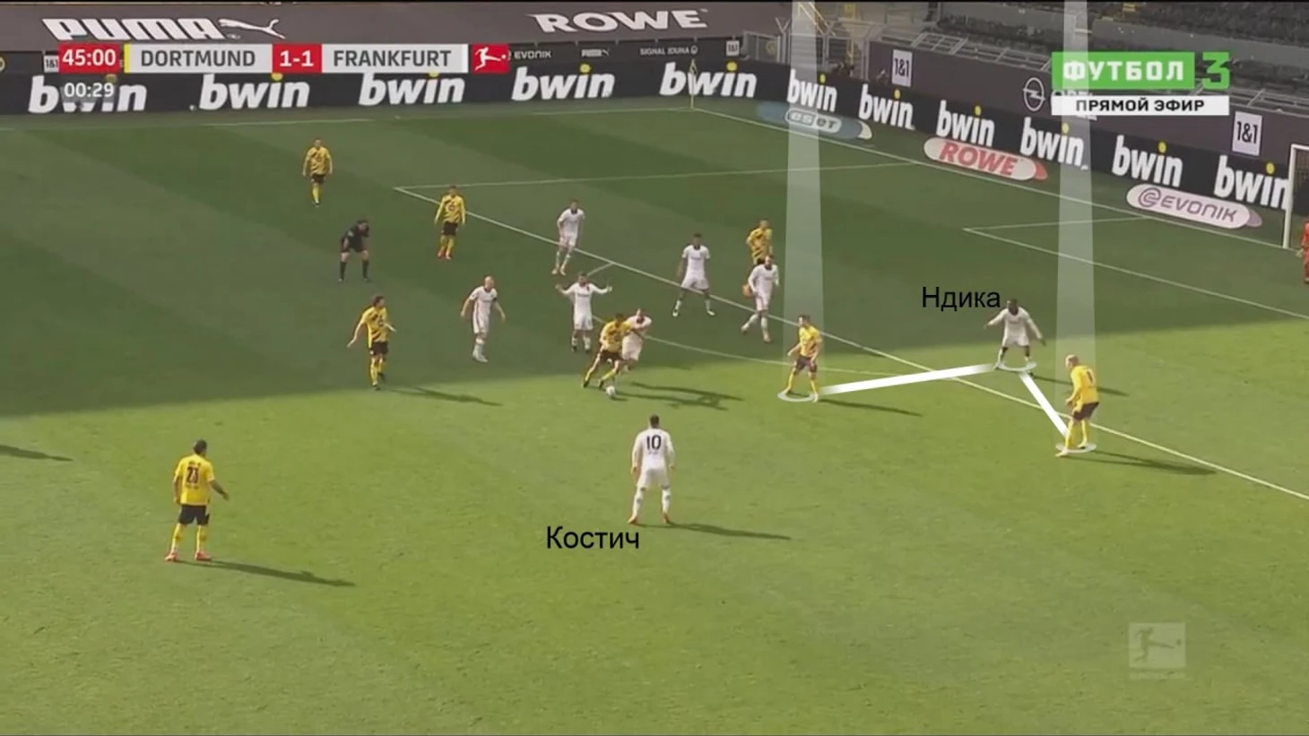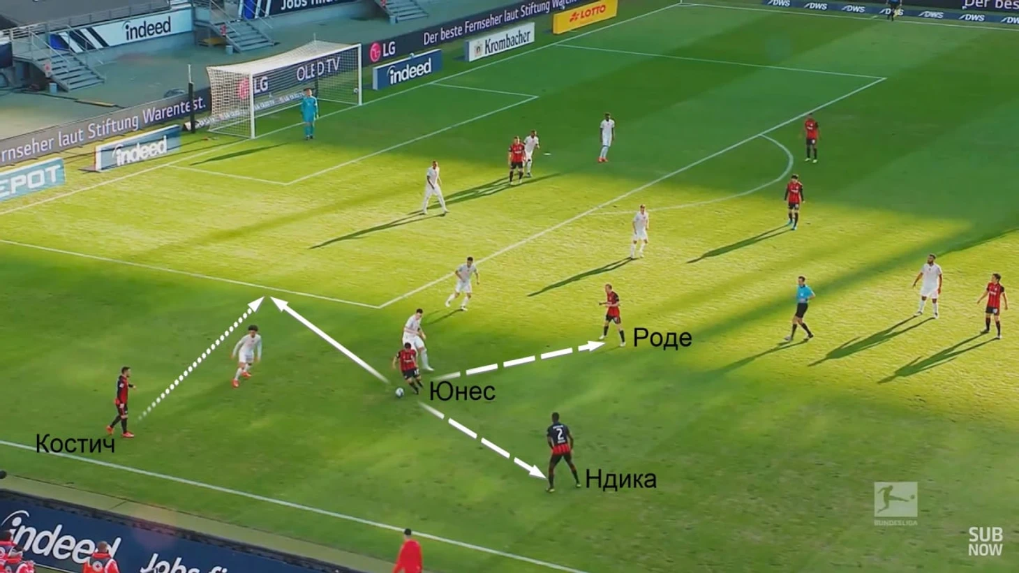 Левая бровка «Айнтрахта» регулярно перегружается – там взаимодействуют Костич, Юнес, восьмерка Хасебе/Роде и левый ЦЗ Эван Ндика. «Франкфурт» опасен и количеством (почти всегда есть численное преимущество), и качеством – навесы Костича, дриблинг Юнеса, диагонали Хасебе и Роде, с помощью которых можно поменять фланг и включить в атаку опасного Камаду.