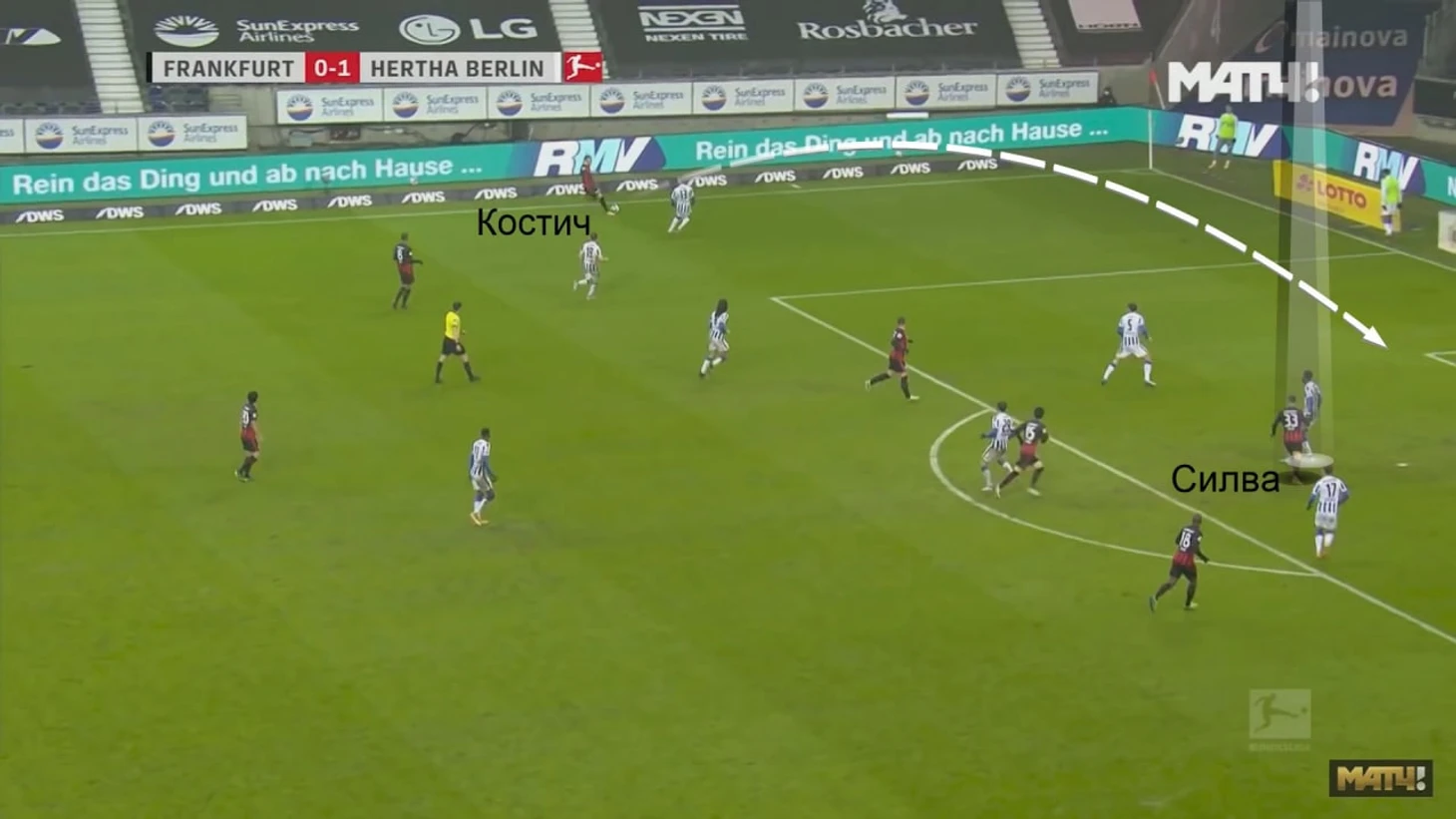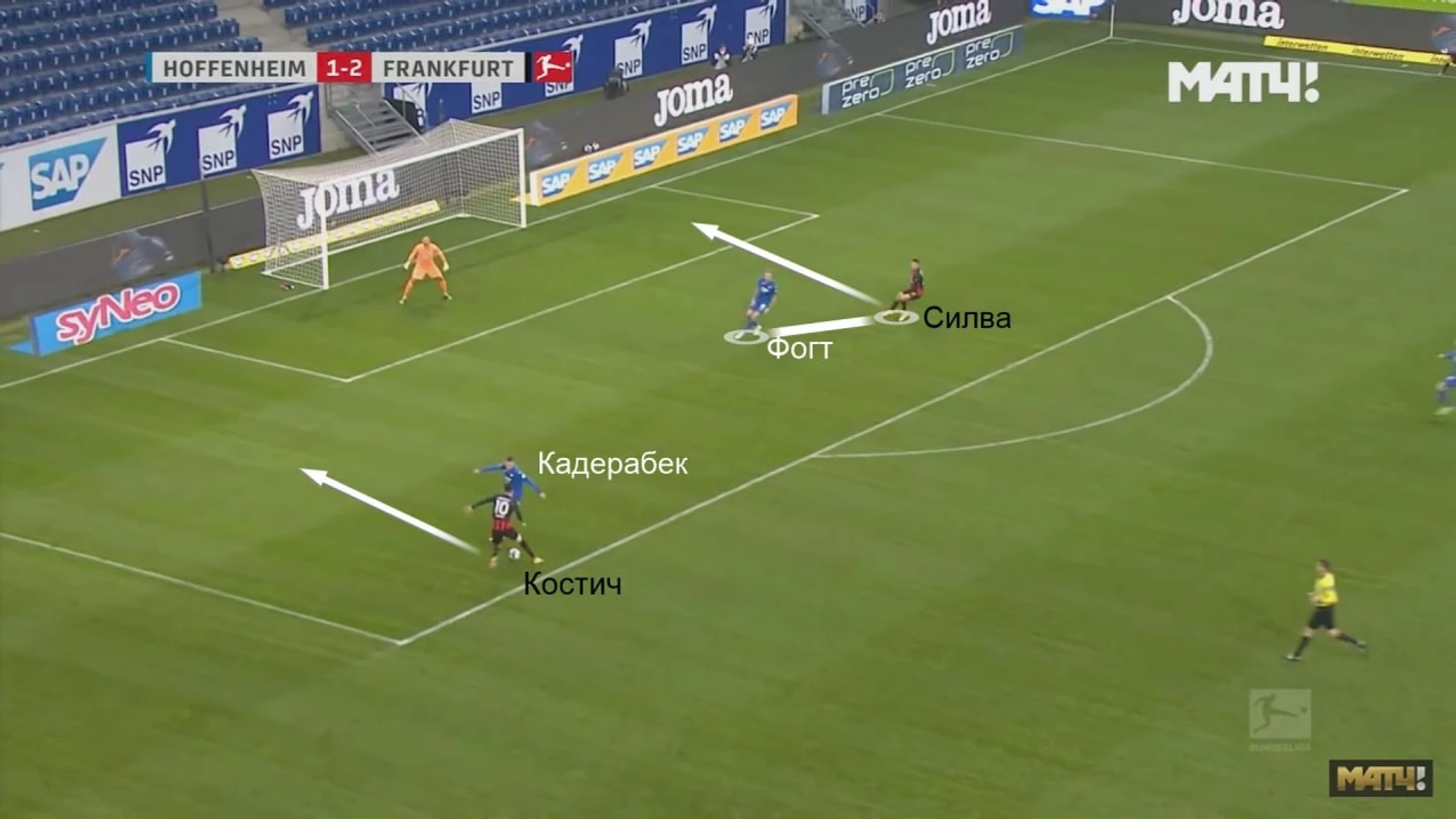 Качественные навесы Костича полезны и в контратаках, иногда серб задерживается впереди, с быстрым возвращением мяча можно сгенерировать быстрый выпад. Так «Айнтрахт» забил любопытный гол «Хоффенхайму»: Костич и Силва убежали 2-в-2, серб приостановился на линии штрафной, Фогт, игравший по Силве, немного замешкался в центре – он хотел подстраховать Кадерабека в случае, если того обыграет Костич (все прекрасно понимают вариативность навыков Филипа).