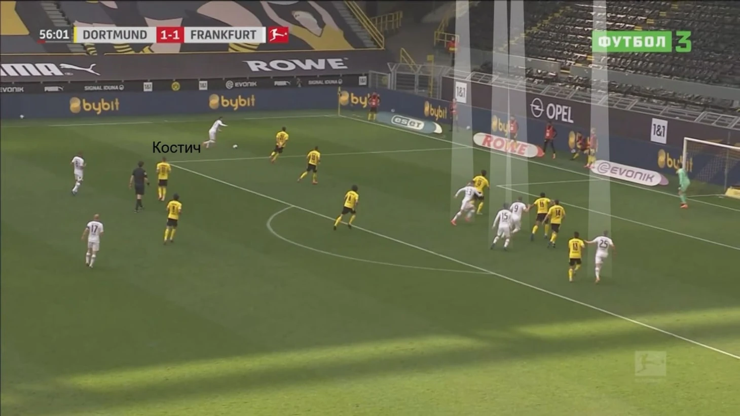 «Айнтрахт» всегда качественно заполняет штрафную под кроссы/прострелы Костича. Обычно у серба четыре потенциальных адресата: два нападающих, атакующий полузащитник и латераль с другого фланга. Командное движение в таких ситуациях доведено до автоматизма: Силва выбегает из-за спин защитников, второй форвард Йович и десятка Камада контролируют 11-метровую зону, фулбэк Дурм движется к дальней штанге.