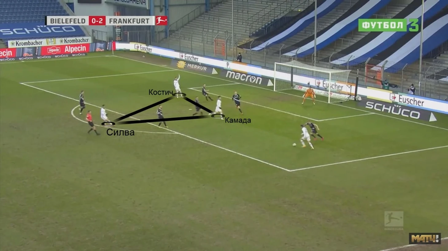 Позиционная мультизадачность серба не ограничивается высоким расположением в контратаках, иногда он оказывается ситуативным форвардом. В матче против «Арминии» штрафную сначала наполнили Костич и Камада, а Силва вбегал уже вторым темпом. Получилось идеально – Филип на отскоке ассистировал Андре.