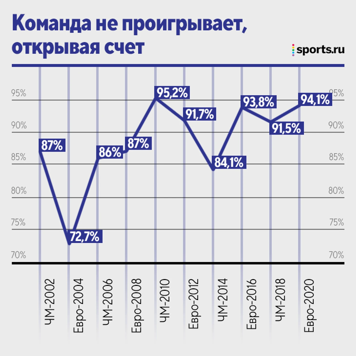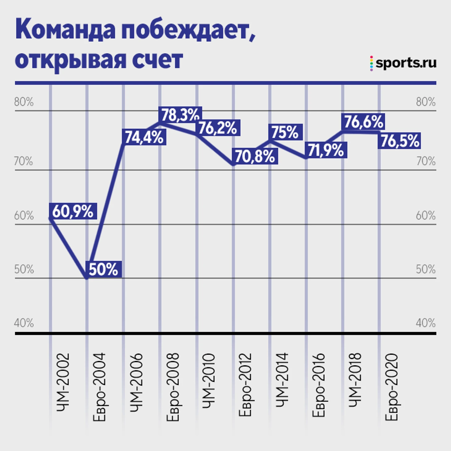 Результаты выглядят ровнее. После аномалии в 2004-м (первый гол стимулировал победу лишь в половине случаев) цифры примерно схожие, с небольшим разбросом (от 70,8% в 2012-м до 78,3% в 2008-м). Такая гармония на дистанции восьми крупных турниров – еще одно доказательство стабильного превосходства команд, открывающих счет.