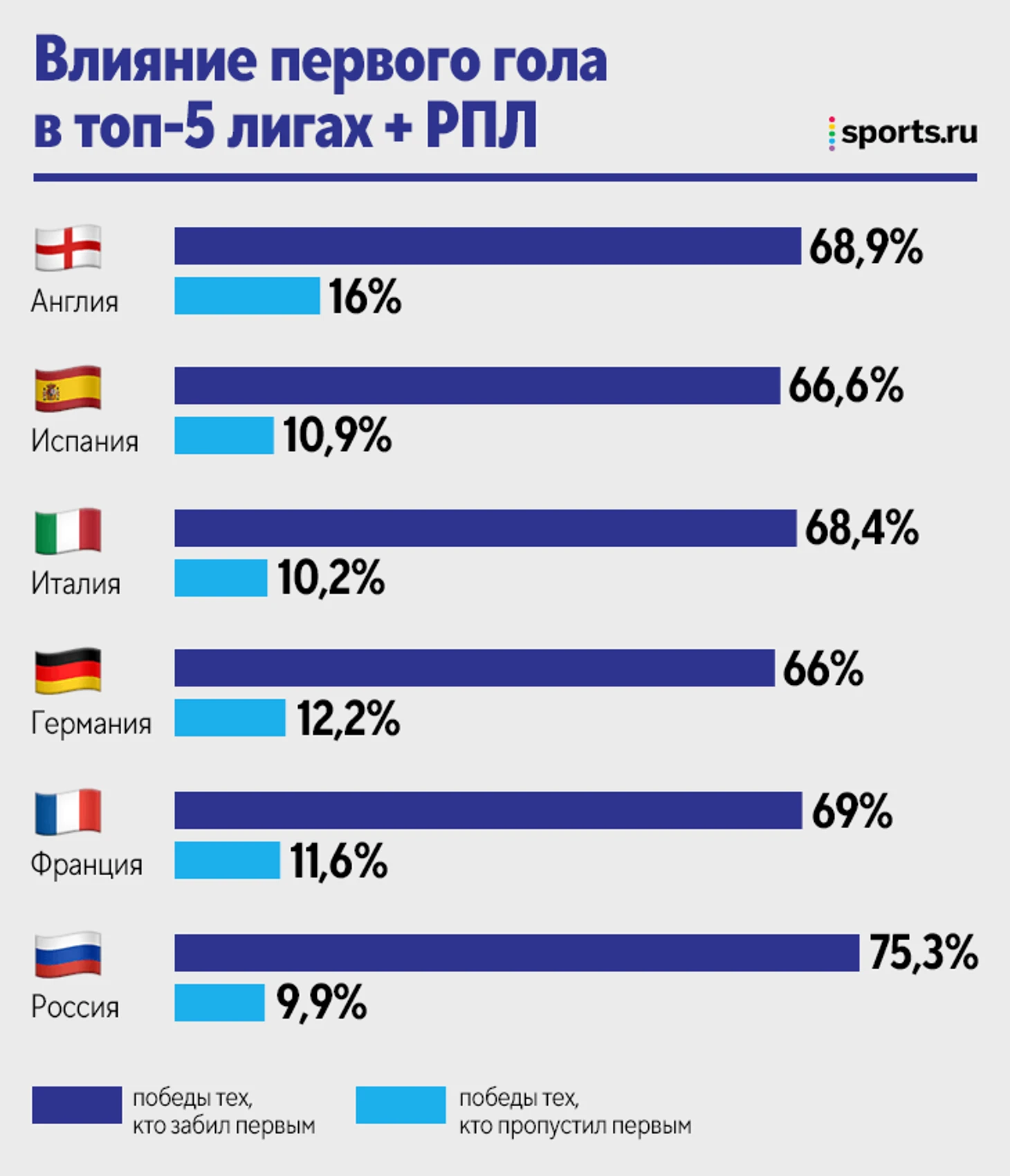 В топ-5 лигах показатель побед тех, кто открывает счет, стабильно держится между 66% и 69%. Только в РПЛ цифра близка к статистике на уровне сборных – 75,3%. При этом по волевым победам российский футбол не сильно отстает от европейского – только АПЛ отрывается с 16%.
