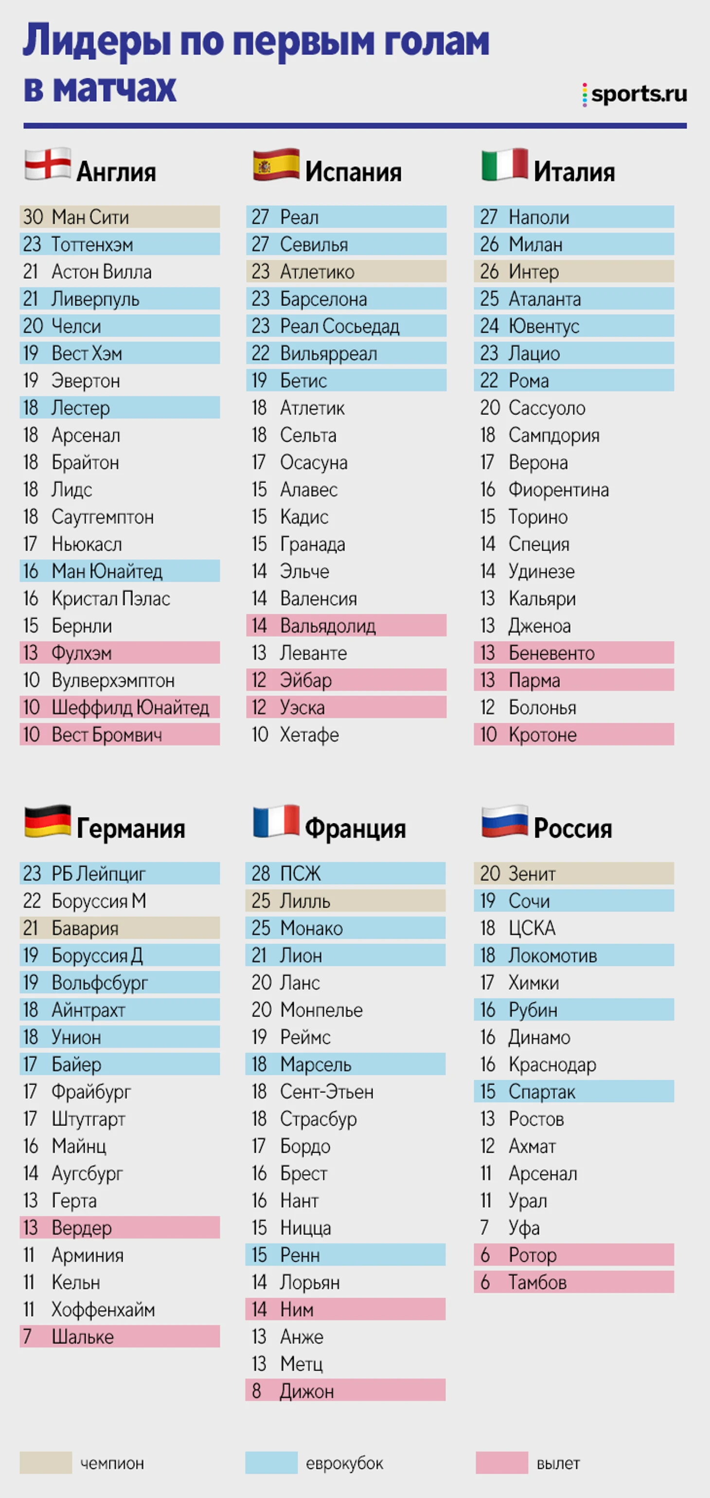 Вернемся к главным европейским чемпионатам – клубы, открывающие счет, в подавляющем большинстве играют первым номером: топ-5 каждой лиги по первым голам состоит из команд, которые в среднем владеют мячом больше 50% времени. Единственное исключение – «Астон Вилла» (примечательно, что клуб не попал в еврокубки).