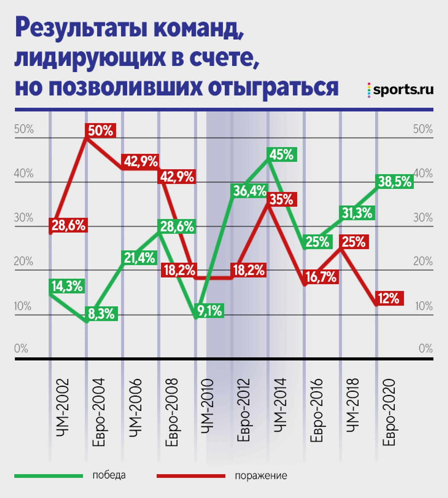 Сами по себе цифры довольно хаотичны и постоянно скачут. Но глобальная тенденция есть – посмотрите на график до и после Евро-2012. До турнира в Украине и Польше команды, которые пропустили, но затем сравняли счет, побеждали чаще тех, кто изначально лидировал, но дал отыграться. Особенно заметна аномалия на Евро-2004 (50% против 8,3%).