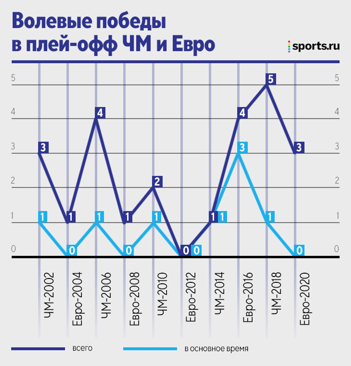 На 20-летнем отрезке всего 40 волевых побед (четыре в среднем за групповой этап каждого турнира). Среди Евро лидирует 2004-й год – шесть волевых (25% от всех матчей в группе), среди ЧМ – 2014-й с семью победами.