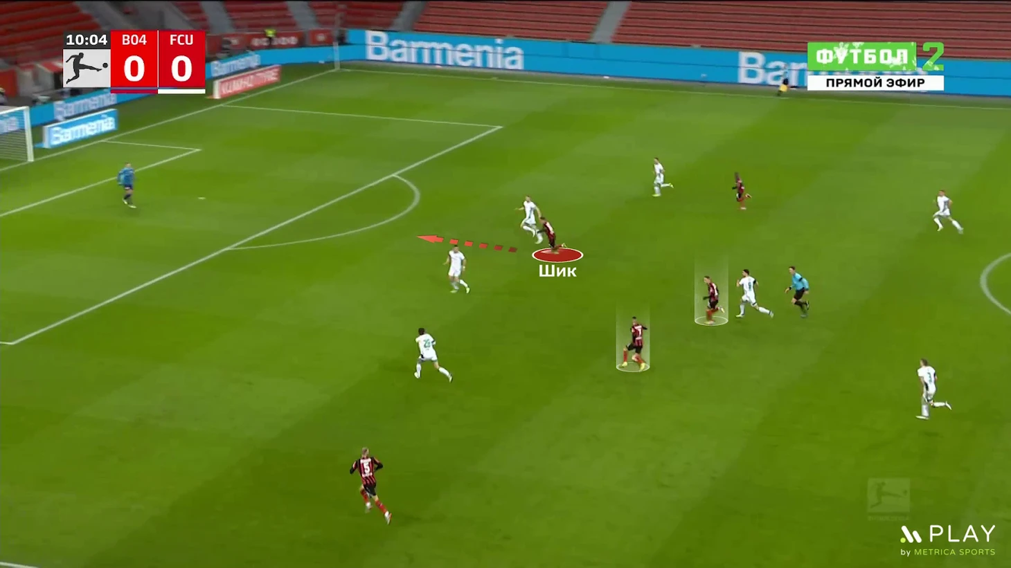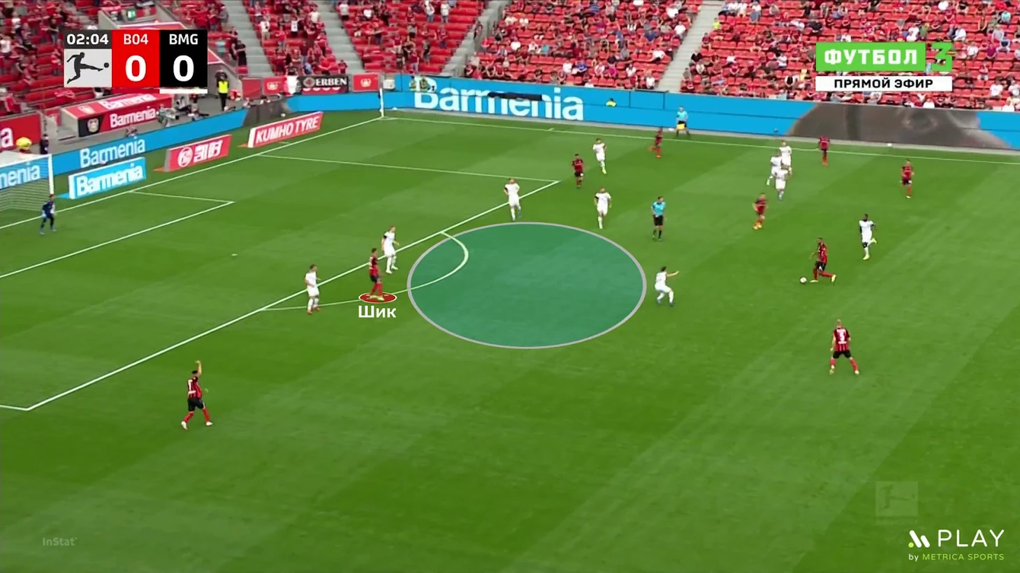 Вот пример из матча с «Гладбахом». Перед Шиком открыта зона – можно откликнуться на пас, вытянув центрального защитника. Но Патрик остался на последней линии.