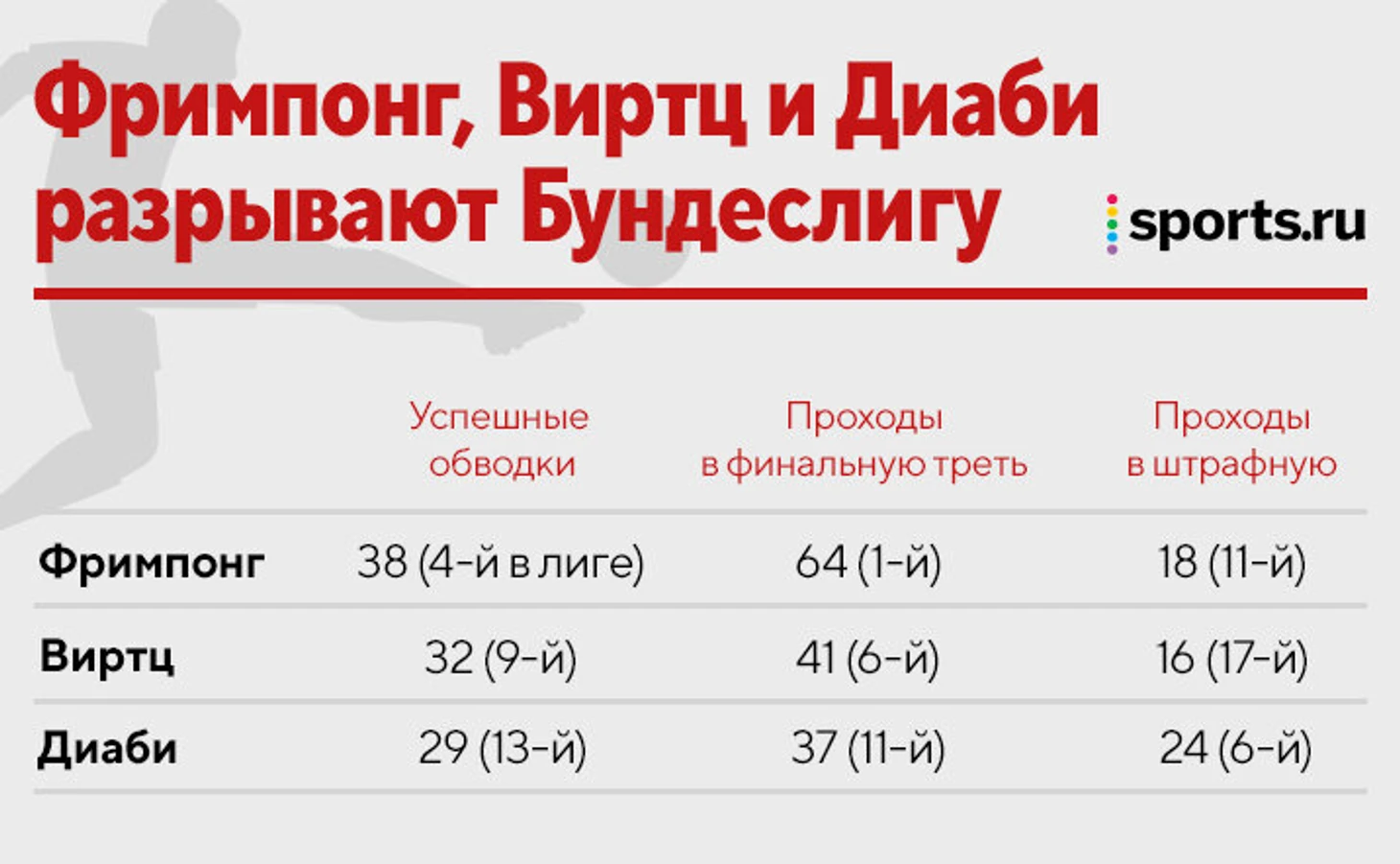 По трем метрикам (успешные обводки, проходы в финальную треть, проходы в штрафную) «Байер» идет на втором месте вслед за «Баварией» – именно Диаби, Фримпонг и Виртц гарантируют успех. Все они отличаются работоспособностью, мощным ускорением и хорошей техникой, позволяющей качественно владеть мячом и успевать обыгрывать даже при разгоне.
