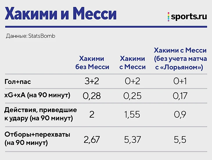 Статистика без учета матча с «Лорьяном» важна, потому что это один конкретный феноменальный матч Хакими: 8 действий, приведших к удару, 6 пасов в штрафную, 4 успешных обводки и ассист. Возможно, фактор чересчур автобусного соперника – Хакими не боялся подключаться даже с Месси на поле. Но и с учетом статистического бума Хакими без Месси все равно лучше по ожидаемой угрозе (xG+xA) и предударным действиям. При этом с Месси марокканец мгновенно прокачивает оборонительные цифры (отборы+перехваты).