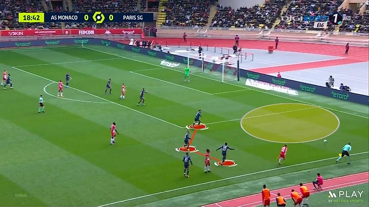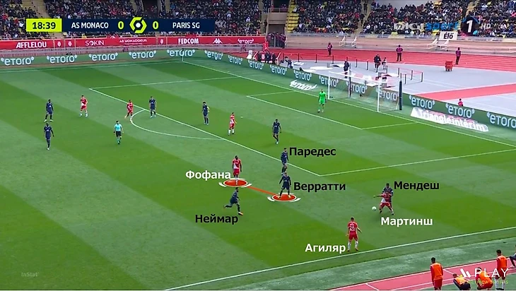 Вот пример из последнего матча с «Монако». Верратти указывает Паредесу, чтобы контролировал полуфланг, а сам следит за Фофана. Игроки «Монако» разыгрывают аут так, что Мартинш ставит корпус Мендешу, а Агиляр пробрасывает мяч на ход. Мендеш недовольно размахивает руками в сторону Верратти, Паредес с опозданием выбрасывается на Агиляра и не мешает нормально подать.