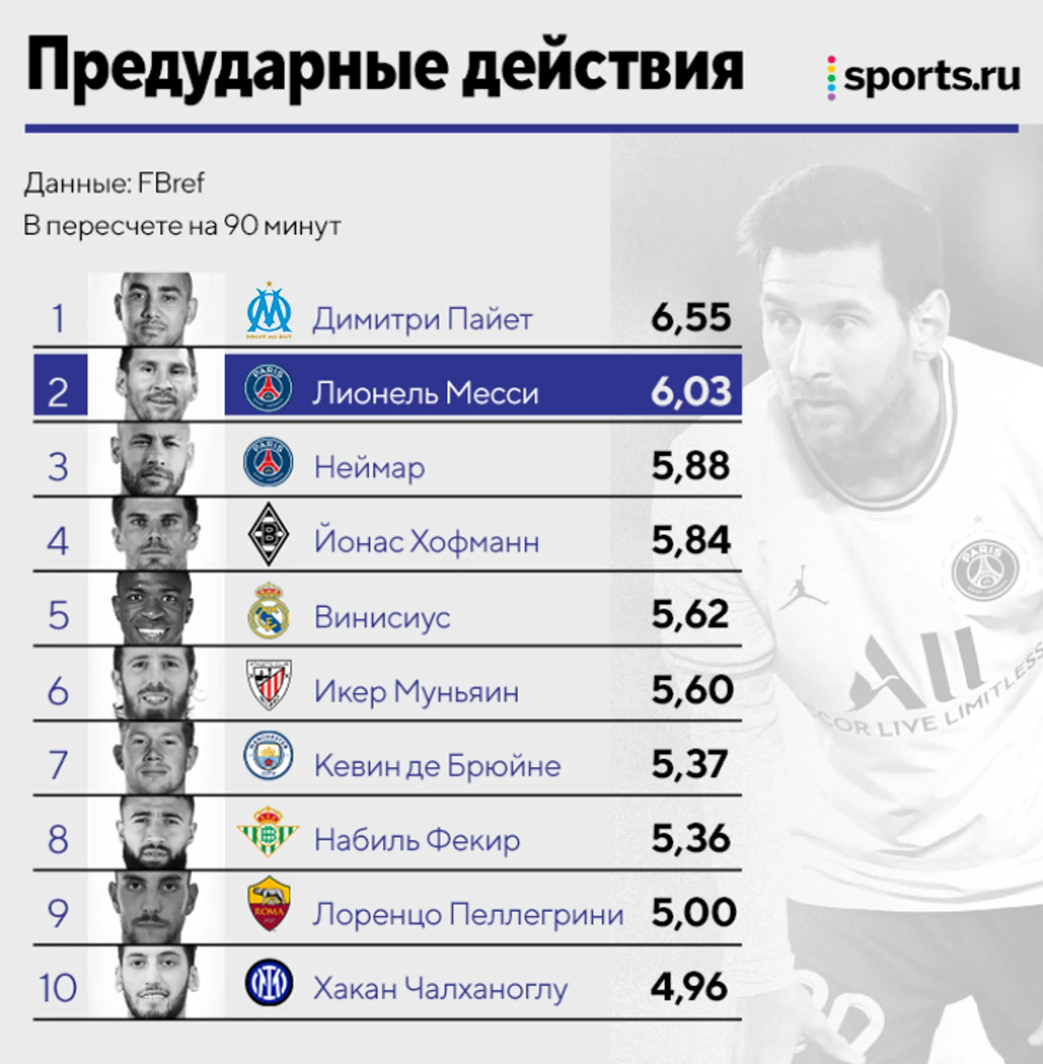 • Спойлер: единственный показатель в статистике предударных действий, в котором Лионель Месси занимает первое место.