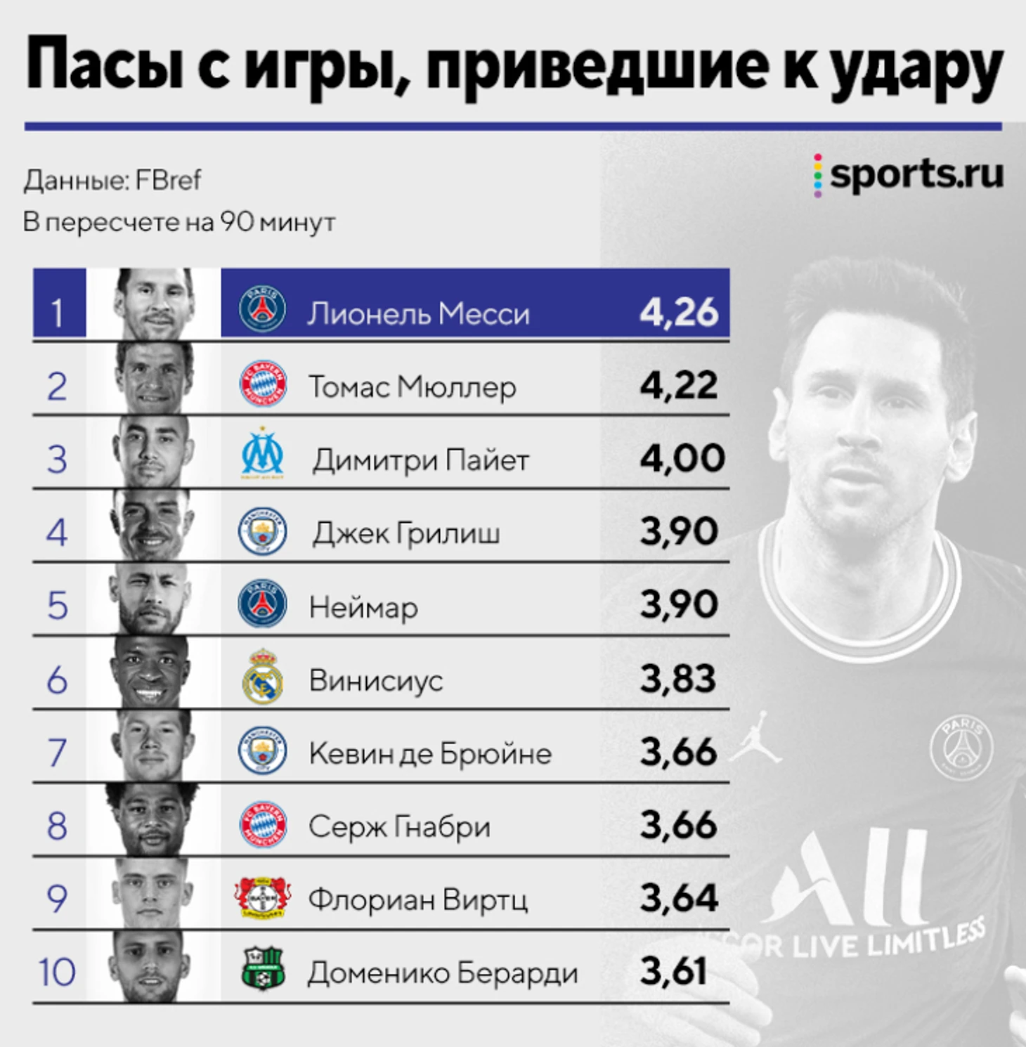 • За Месси следуют Томас Мюллер и Димитри Пайет. В абсолютных значениях у них больше всех передач, приведших к удару, – 113 и 112. У Месси – 89 и девятое место.