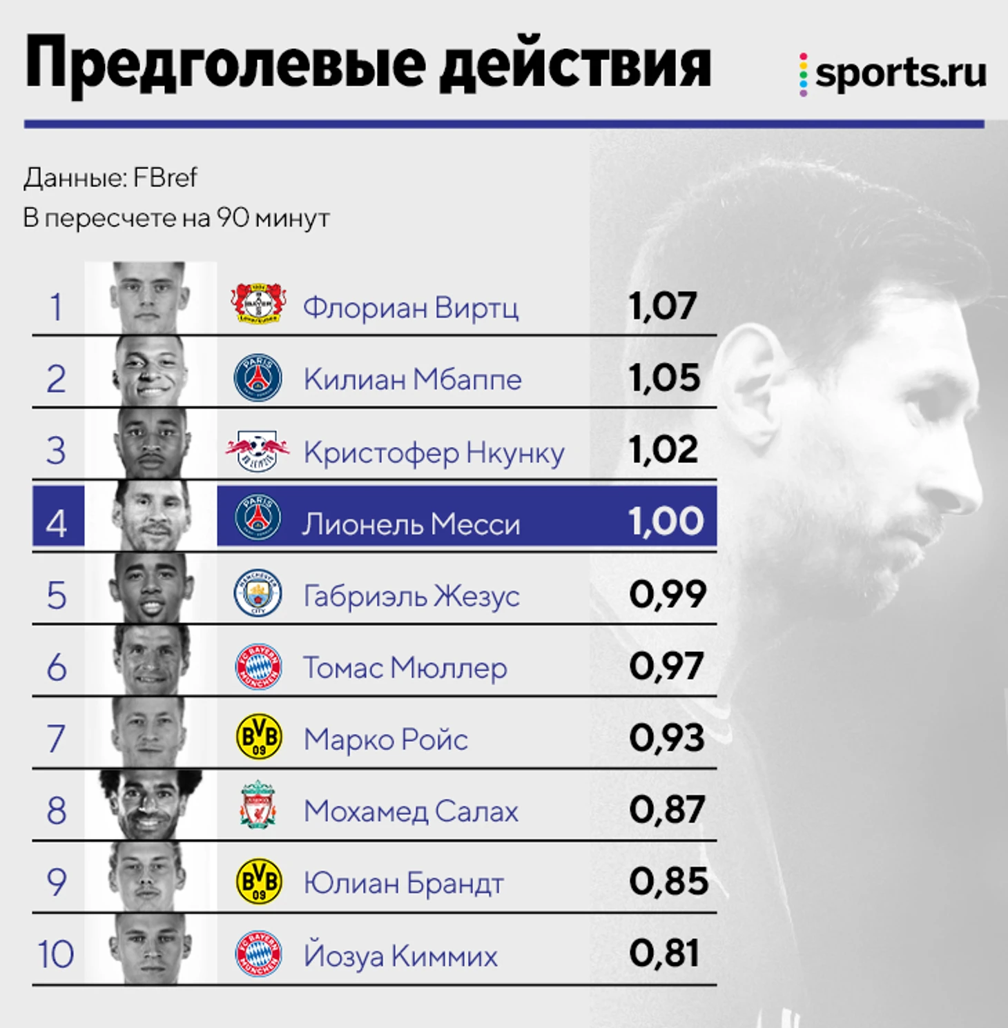 • Нет, Месси и тут не первый. Даже чуть спустился – четвертое место. Ровно одно предголевое действие в пересчете на 90 минут. Тоже проседание в сравнении со временами в «Барсе».