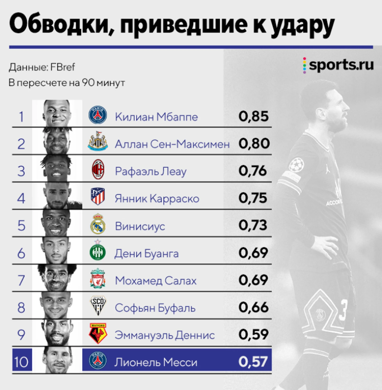 • Килиан Мбаппе на первой позиции. Отличный показатель, но в его карьере уже было и больше – в сезоне-2019/20 он набил 1,13 обводки, приведших к удару, на 90 минут.