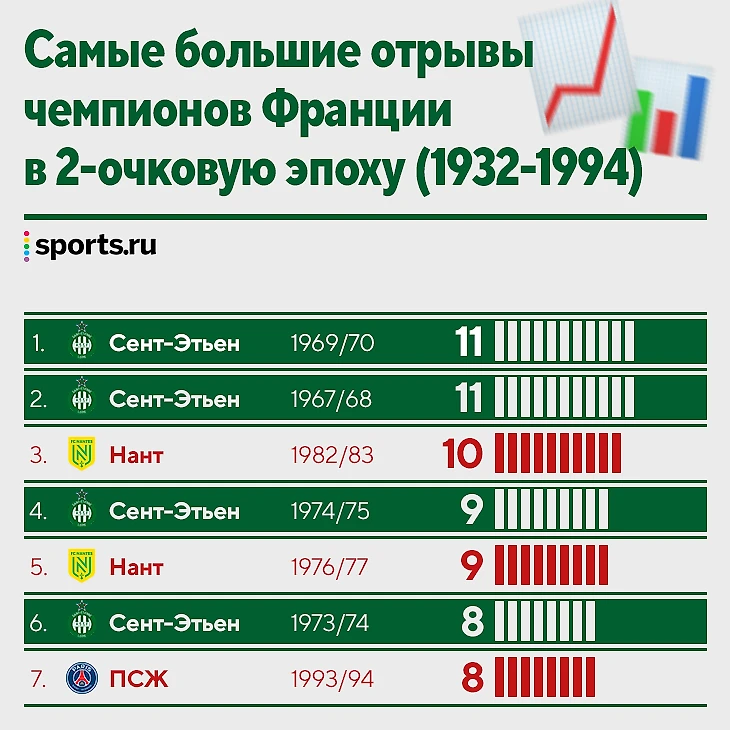 И ценно, что «Сент-Этьен» именно доминировал. Это доказывает список чемпионов с самыми большими отрывами за шесть десятилетий французского футбола, когда за победу давали 2 очка, а не 3. В топ-7 – сразу четыре титула «Сент-Этьена».