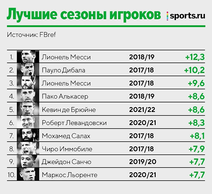Но есть и обратные примеры. Де Брюйне и Левандовски держат в активе еще один сезон с результатом выше +4 (сильный показатель), у Иммобиле – еще два таких сезона, у Месси – три.