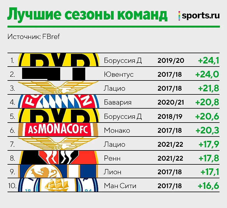• «Боруссия» повторяет трюк Месси: топ-1 и на дистанции, и по конкретному сезону. Немцы выбили +24,1 в 2019/20. И «Дортмунд» тоже попал в топ-10 дважды – пятое место за +20,6 в 2018/19. Но тут это не эксклюзив – «Лацио» тоже видим дважды.