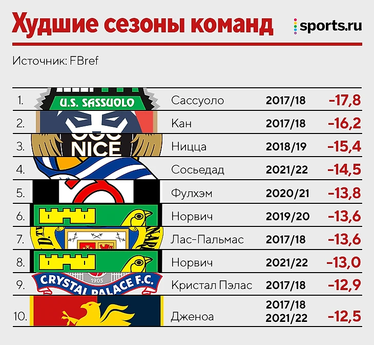 • В топ-10 нет ни одной команды из Бундеслиги. Худший сезон от немецкой команды – «Кельн»-2017/18 с -10. Тогда клуб занял последнее место и вылетел во второй дивизион.