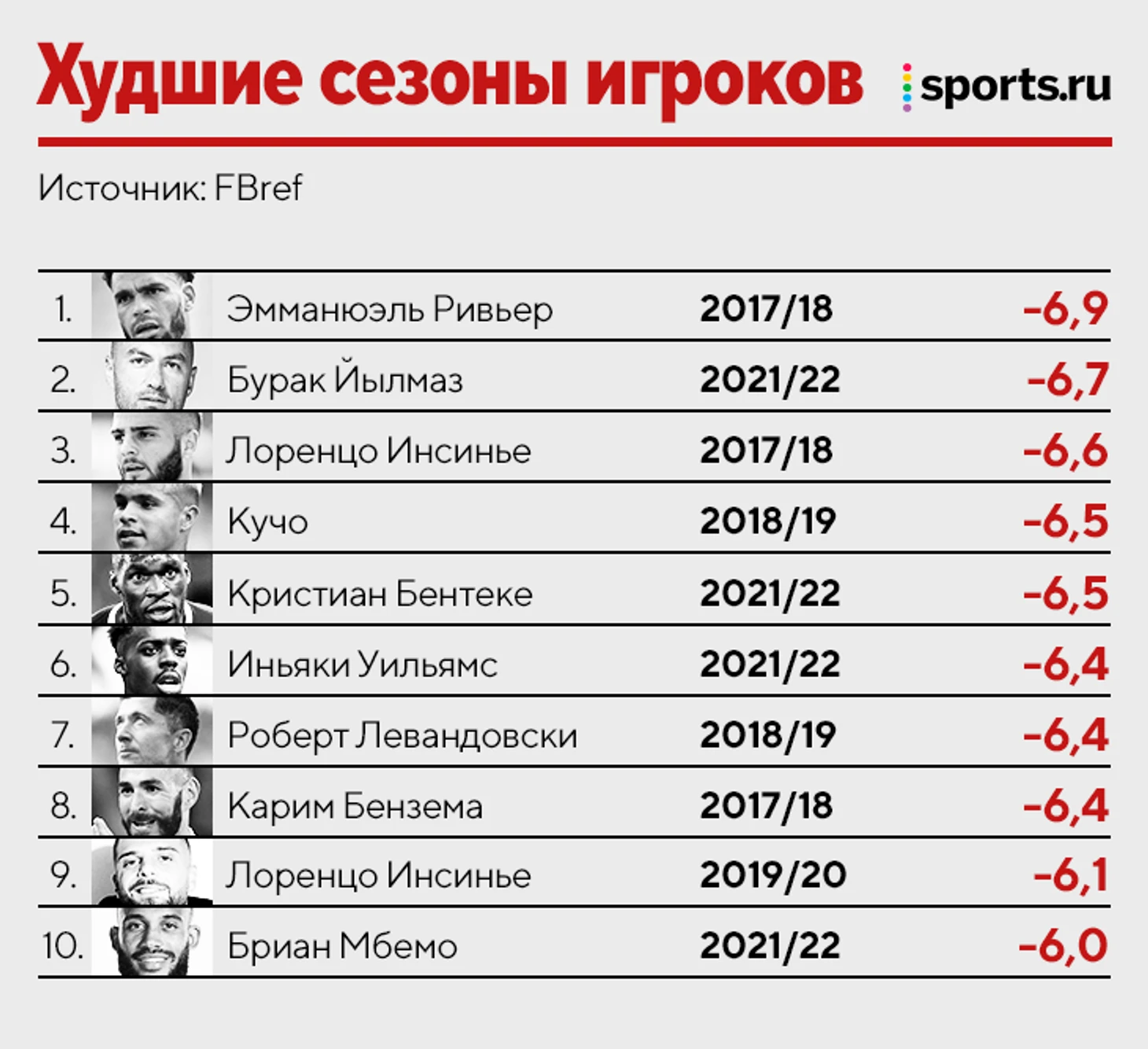 • В сезоне-2018/19 Роберт забил на 6,4 меньше ожидаемого – ужасный результат для топ-нападающего. Только Левандовски попал и в топ-10 индивидуально самых сильных сезонов, и в топ-10 самых слабых.