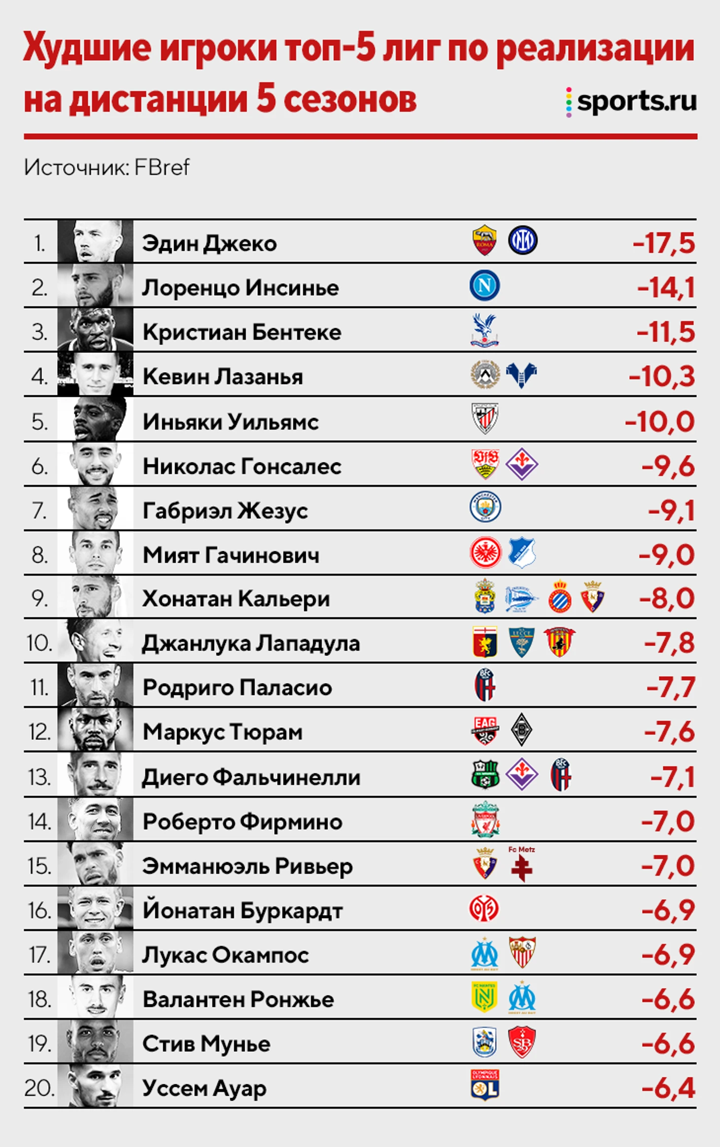 • Промахи Эдина Джеко в пустые ворота с метра – классика «Ромы». В «Интере» он почти добрался до нуля (-0,2 в сезоне-2021/22), но в итоге все пять лет безвылазно сидит в минусе. Самом крупном среди всех футболистов топ-5 лиг.
