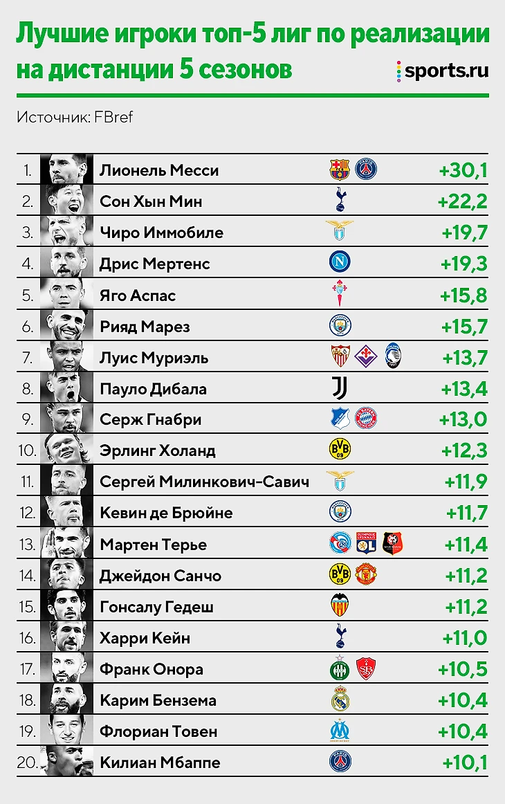 • Лионель Месси мощнее других превосходит xG. Забавно, что год в «ПСЖ» только испортил статистику – до него было +34,1 за 4 сезона.