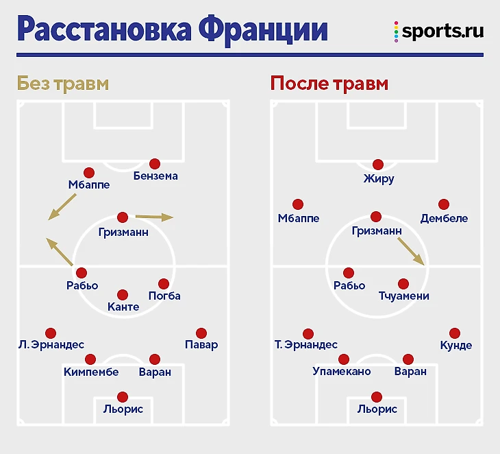 Естественно, изменения – следствие длиннющего списка травмированных: в центре поля нет Погба, Канте и Бубакара Камара (ему Дешам давал много шансов в Лиге наций), в атаке – Карима Бензема и Кристофера Нкунку, в защите без Преснеля Кимпембе.
