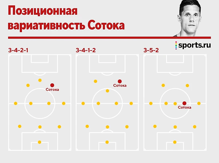 И пусть. Потому что Сотока превратился в одного из умнейших футболистов лиги. Флориан преуспевает в поиске пространства между защитой и полузащитой соперника, в обостряющих передачах за спины, а еще уместно оттягивается в глубину (чтобы помочь с продвижением) и на фланги (чтобы перегрузить фланг, растянуть линию защиты или попробовать обострить из более свободной зоны, чем центральная ось).