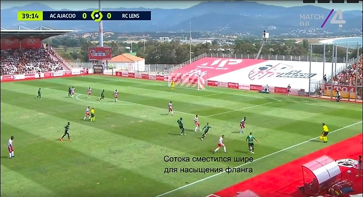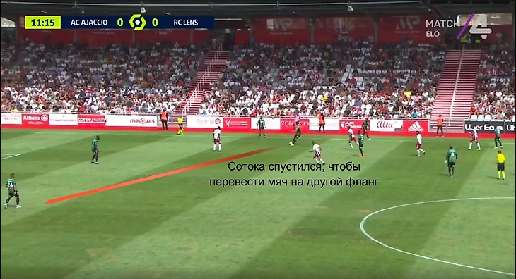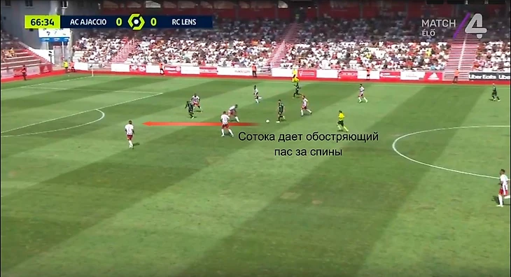 Вот примеры из игры с «Аяччо» (0:0) – не самая яркая игра «Ланса» и Сотока, но все равно заметна его помощь в разных стадиях атаки.