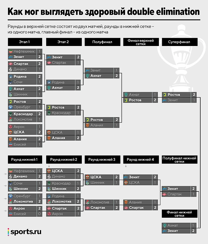 Можно дать победителю верхней сетки преимущество в суперфинале – допустим, иногда в киберспорте в серии до трех побед победитель верхней сетки стартует с преимуществом 1:0. Да, это может звучать супернеобычно, но год назад так же необычно звучала и сама идея двойного выбывания в футболе.