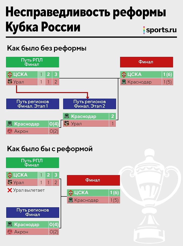 С реформой «Урал», занявший первое место в группе Пути РПЛ, выбивший в плей-офф «Ростов» и «Спартак», уступивший ЦСКА в финале Пути РПЛ лишь в один гол по сумме двух матчей, не получил бы второй шанс, который был у «Краснодара», «Спартака», «Динамо», «Локомотива», «Крыльев Советов», «Ростова». Они проиграли в верхней сетке, но благополучно спустились в Путь регионов.