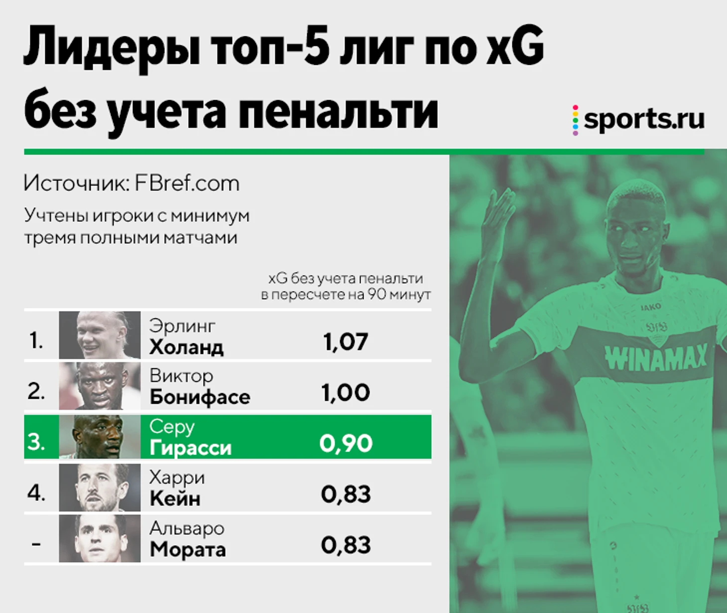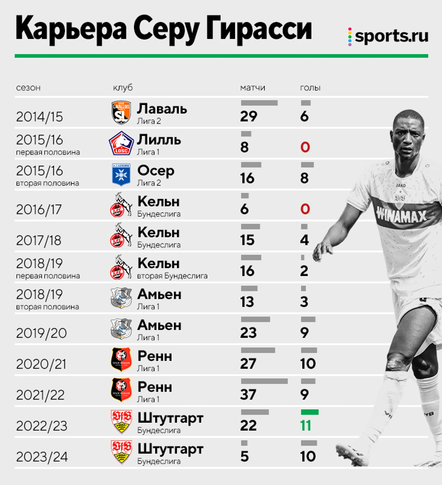 В январе-феврале 2024 года Гирасси оставит «Штутгарт» ради Кубка африканских наций. Вообще никаких гарантий, что Гирасси при 10 голах за пять туров забьет хотя бы 20 за весь сезон. Но сколько забьет – это уже гадания.