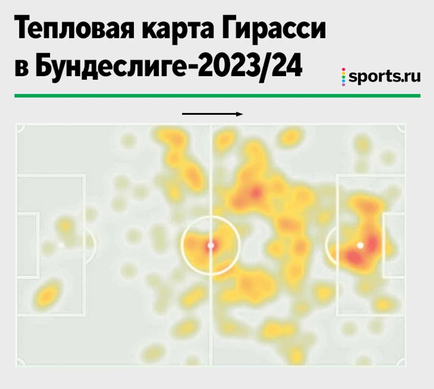 И очень важный пункт: Гирасси полезен «Штутгарту» не только благодаря голам. Он продолжает цепляться за длинные передачи, как постоянно делал это в «Амьене». Уходит в глубину, выманивая защитников и открывая пространство для партнеров. Оцените тепловую карту Гирасси: ярко горит штрафная (Гирасси стабильно находит множество моментов) и левый полуфланг, куда Серу смещается для помощи в продвижении.