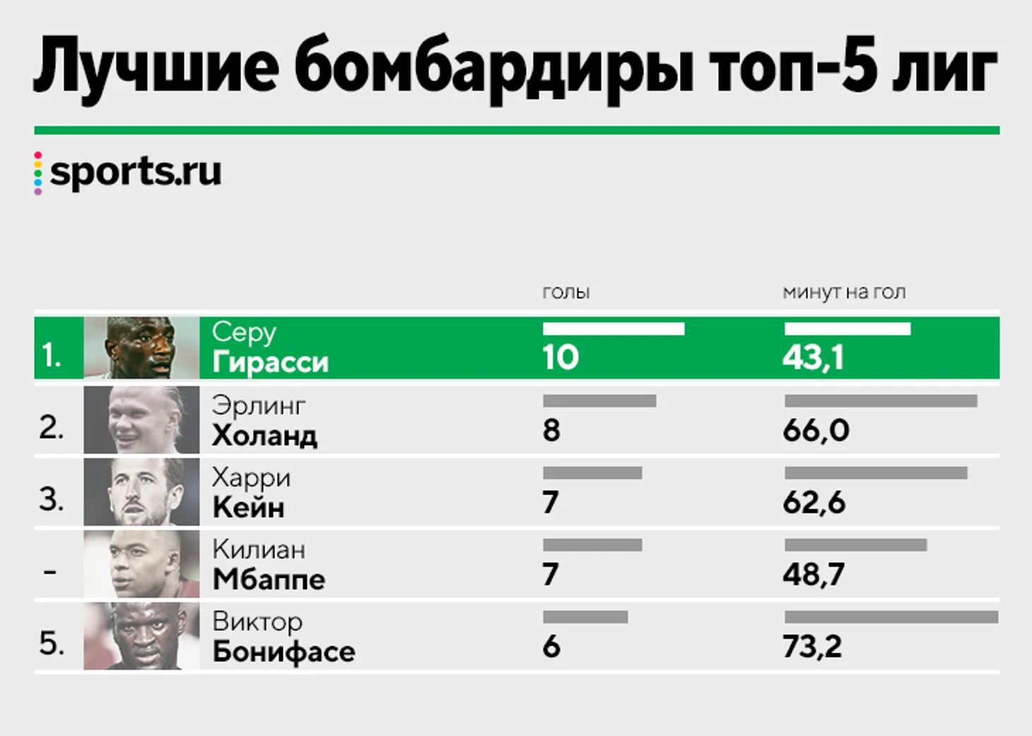 Все 10 мячей Гирасси – с игры. Холанд и Бонифасе по разу забивали с пенальти (Холанд еще однажды смазал), Кейн и Мбаппе реализовали по два 11-метровых. Так что по голам с игры Гирасси доминирует в Европе даже внушительнее – только Холанд без учета пенальти тоже забил больше пяти на старте (семь).
