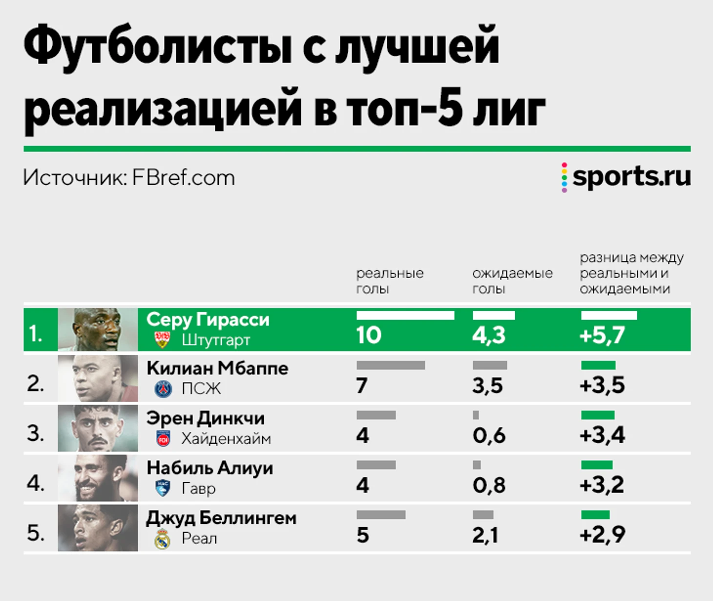 Фиксируем главное: Гирасси забивает больше всех и лучше всех реализует моменты. При этом количество моментов тоже впечатляет – больше, например, чем у Кейна или Левандовского. А ведь Гирасси играет за «Штутгарт», где гораздо труднее выискивать шансы, чем в «Баварии» или «Барселоне».