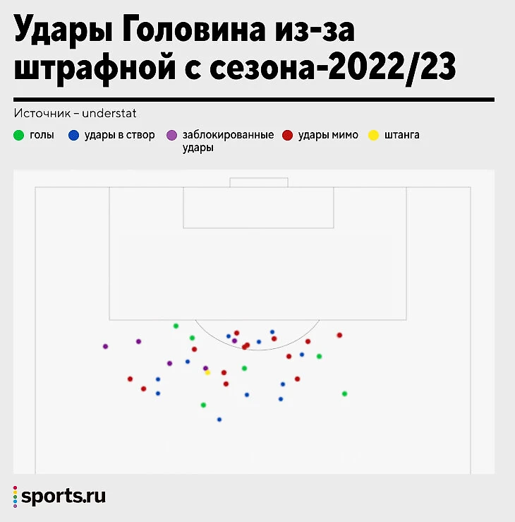 Вот карта ударов Головина издали с сезона-2022/23. Большинство ударов – ожидаемо чуть левее центра. Оттуда правше Головину бить проще. Из шести дальних голов четыре прилетели в правую девятку. Мегагол «Тулузе» – тут (таймкод: 2:05), мегагол «Анжеру» – тут (таймкод: 1:42), мегагол «Метцу» – тут (таймкод: 1:39).