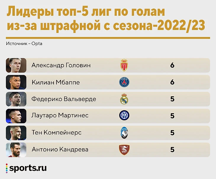 В России давно (может, никогда?) не появлялся футболист, который был лучшим среди лучших, а не только лучшим среди наших. И тут новость: Головин – лидер топ-лиг по голам из-за штрафной с сезона-2022/23. Да-да, лидер среди всех игроков топ-лиг. Красота.