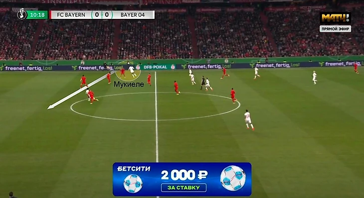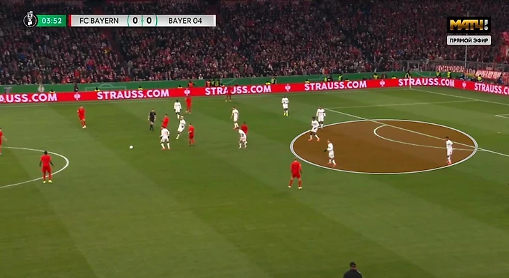 Тут подсвечиваю глобальную проблему заполняемости штрафной, в равных составах это гораздо серьезнее, чем в меньшинстве. И на самом деле «Бавария» правда очень достойно выглядела вдесятером. Не ошибалась под давлением, хороший контроль мяча. Ни намека на психологическую неустойчивость после реально шокирующего инцидента (а красная на 17-й минуте – из таких). Алонсо показывал «прессингуйте» – «Бавария» не теряла мяч. Пару раз сама накрывала «Байер» в прессинге и контрпрессинге.