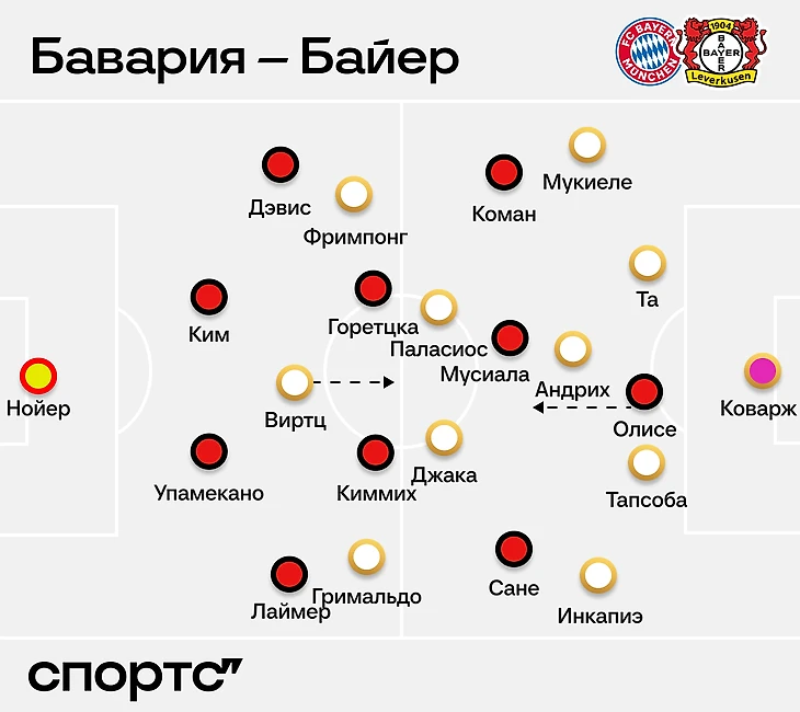 Очень показателен второй тайм. До гола Натана Теллы не было никакого ощущения, что «Байер» обязан забить. Команда в большинстве с трудом доходила до чужой штрафной. «Бавария» здорово сушила игру, даже не отдавая территорию. Но важен и другой факт: сама «Бавария» нанесла первый незаблокированный удар во втором тайме лишь на 89-й минуте. И то именно со стандарта. А у «Байера», который почти не атаковал, были и гол Теллы, и удар Виртца после прострела Фримпонга в начале тайма.