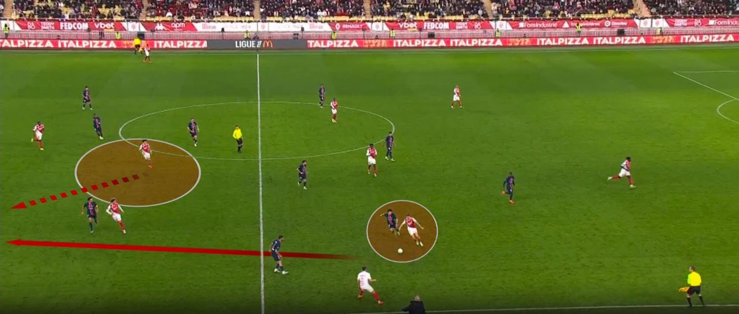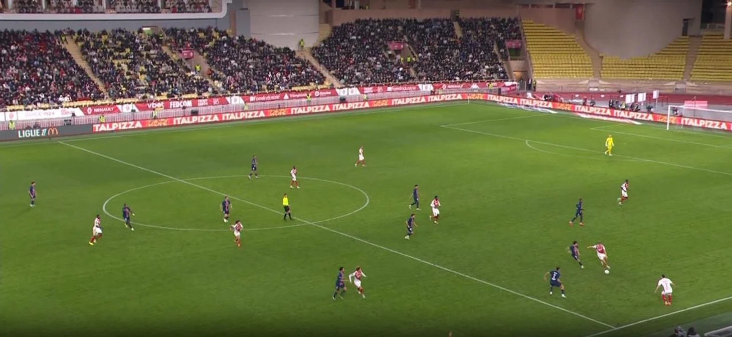 У «Монако» хорошая линия игроков под нападающим: Бен-Сегир, Аклиуш, Такуми Минамино, но ни один из них не способен регулярно играть, как Головин в описанной атаке. Бен-Сегир и Аклиуш нацелены на дриблинг (Аклиуш еще и здорово пасует, но уже в финальной фазе), Минамино включается дополнительным форвардом.