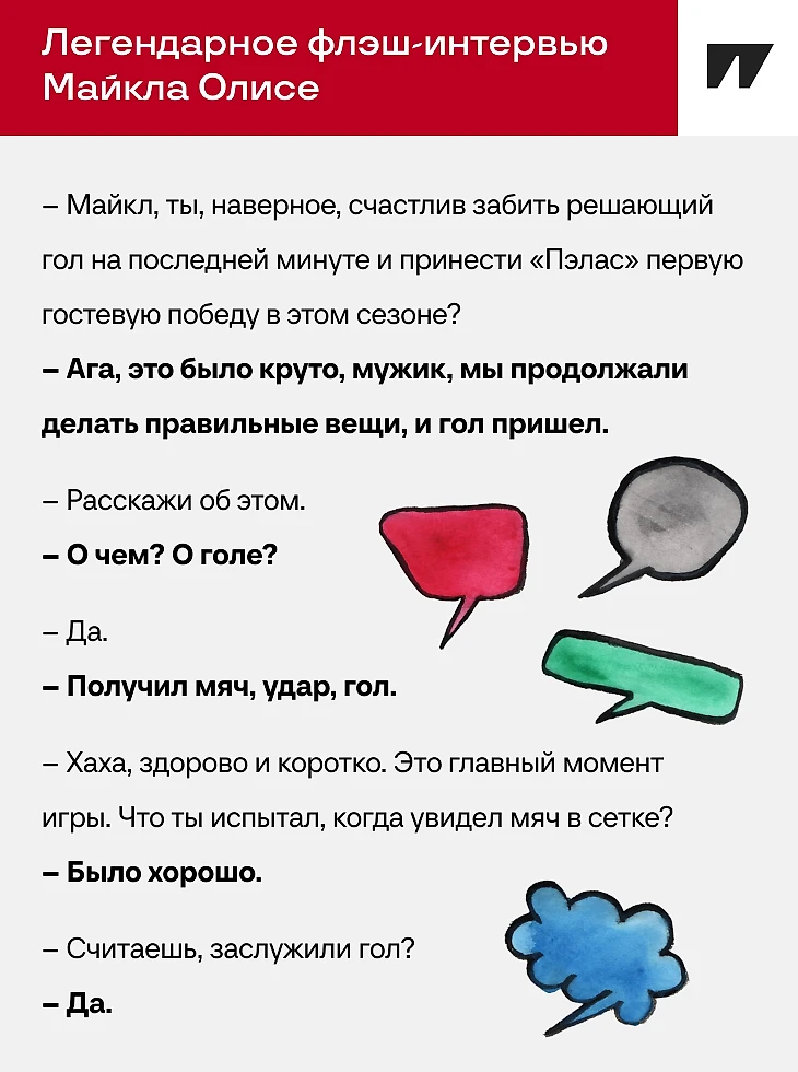 В комментариях хвалят Олисе, что отвечает по делу и таким образом показывает глупость вопросов, на которые непросто ответить развернуто. Многим нравится другая фишка Олисе – он иногда не празднует сложные и важные голы. Например, играя за «Пэлас», Майкл спас команду от поражения против «МЮ» прямым ударом со штрафного с острого угла на 91-й минуте. По ссылке можно оценить гол и празднование (точнее, его отсутствие).