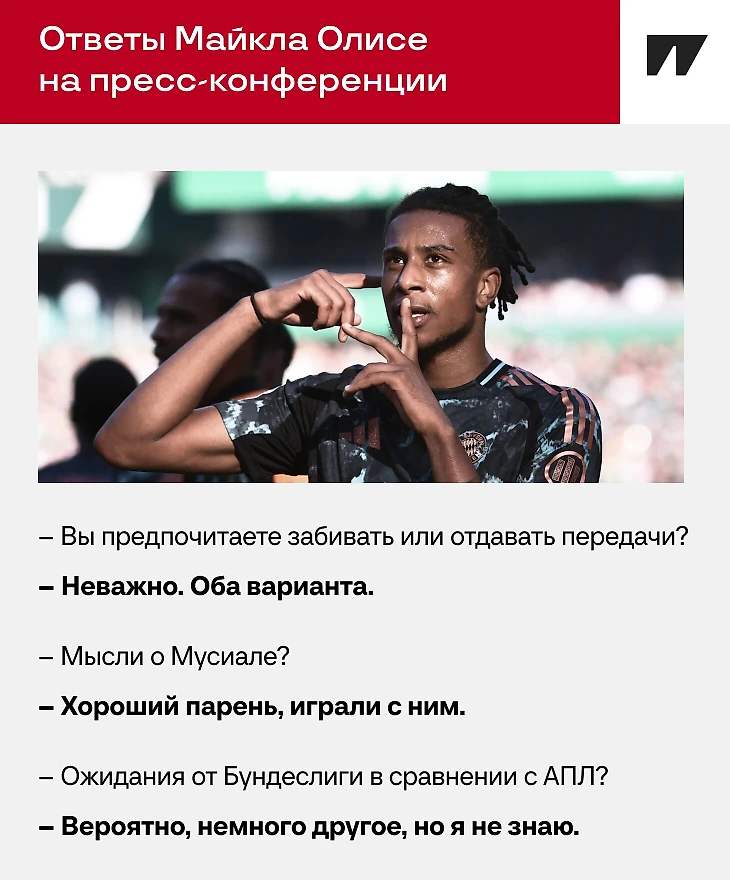 Более того, по многим показателям Олисе первый-второй во всей команде, не только среди вингеров. По гол+пас во всех турнирах обгоняет даже Джамала Мусиалу, впереди только Харри Кейн. У Олисе 8+12 в Бундеслиге, 5+1 в ЛЧ и 0+1 в Кубке Германии. Любит и забивать, и отдавать – не обманул на пресс-конференции.