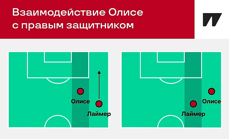 Олисе никогда не застревает с правым защитником в одном вертикальном коридоре, всегда по диагонали, это база футбола Венсана Компани. Если правый защитник широко, Олисе в полуфланге. И наоборот.