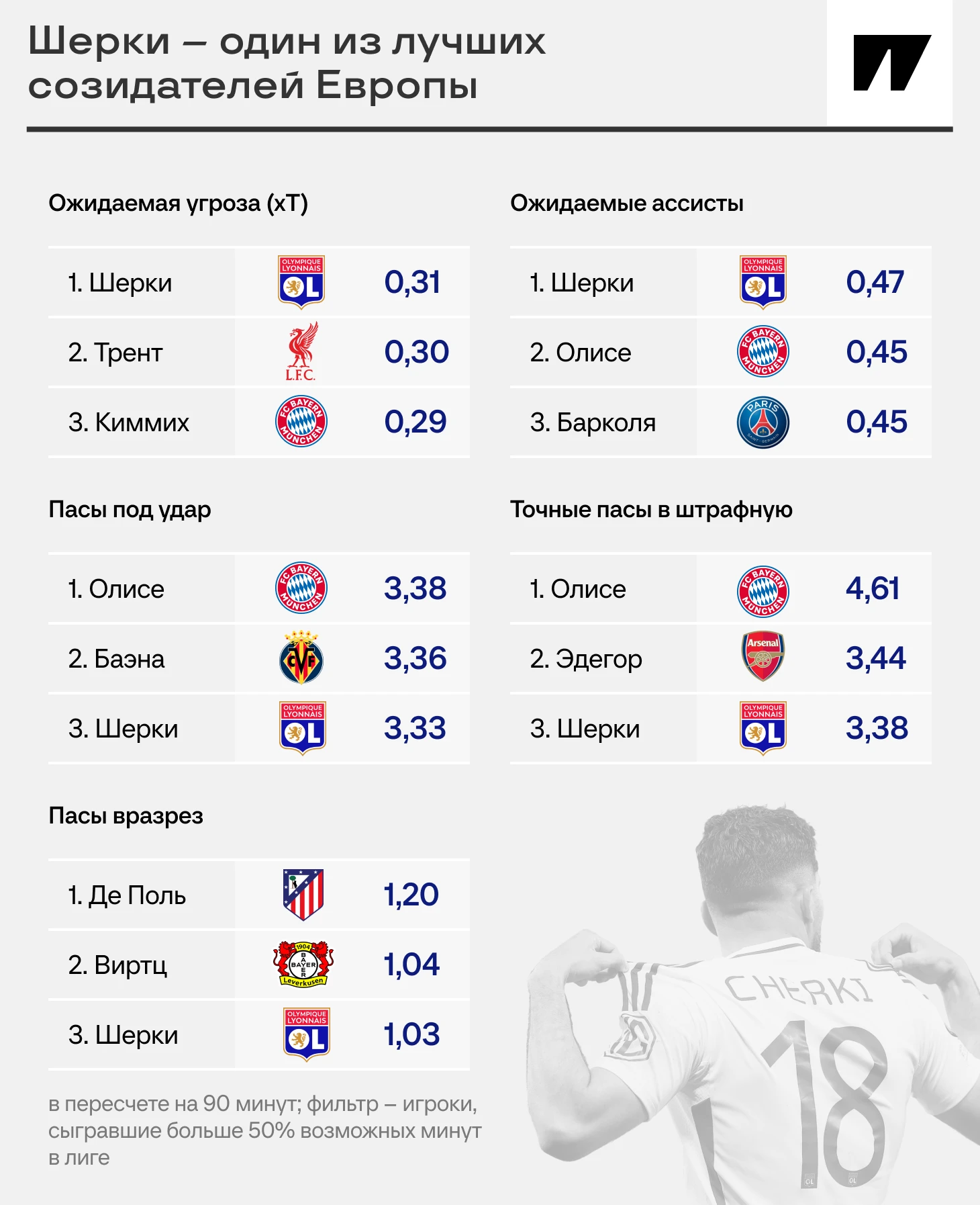 Конечно, Шерки – постоянный поставщик моментов для Александра Ляказетта и Жоржа Микаутадзе, профильных центрфорвардов «Лиона». Они в первую очередь открываются под прострелы Шерки и передачи вразрез. Оба забили по три гола с его пасов – лучший результат в Лиге 1. Ляказетт должен забивать больше, но подводит реализация.