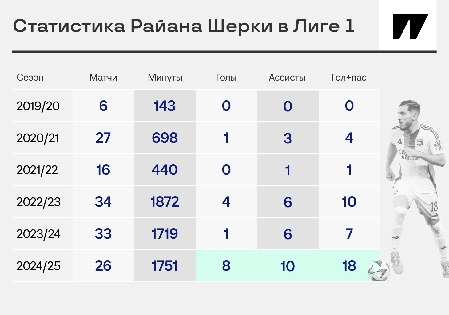 Вот основная статистика Шерки за все сезоны в «Лионе». В первых трех он ни разу не пробил отметку в 1000 минут, так и не закрепился как игрок основы. В следующих двух поднялся в старт, но не восхищал голами и ассистами. Только в текущем сезоне стал звездой Лиги 1.