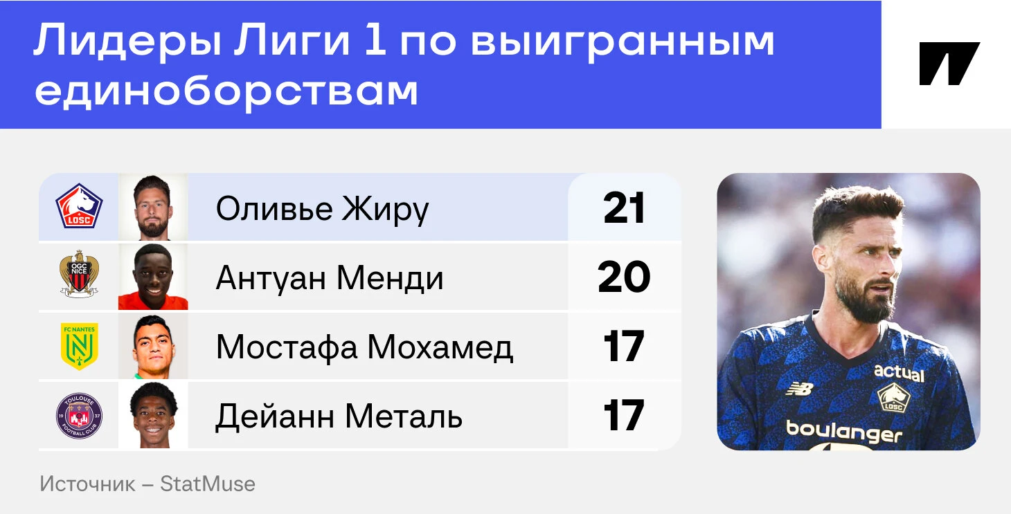 Два матча подряд – против «Бреста» и против «Монако» – Жиру лидирует по выигранным единоборствам. Понятно, что выборка маленькая, но «Брест» – лидер прошлого сезона по выигранным единоборствам (1810), «Монако» на втором месте (1804). То есть Жиру доминировал в борьбе против самых атлетичных команд Франции.
