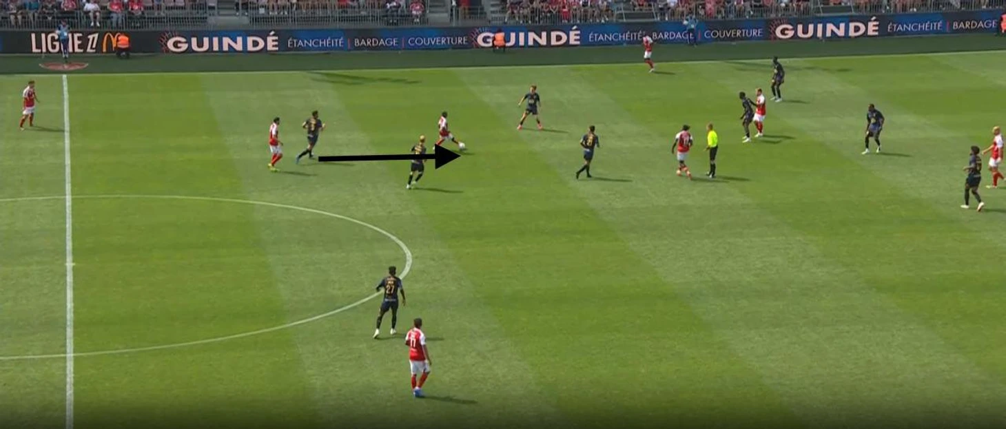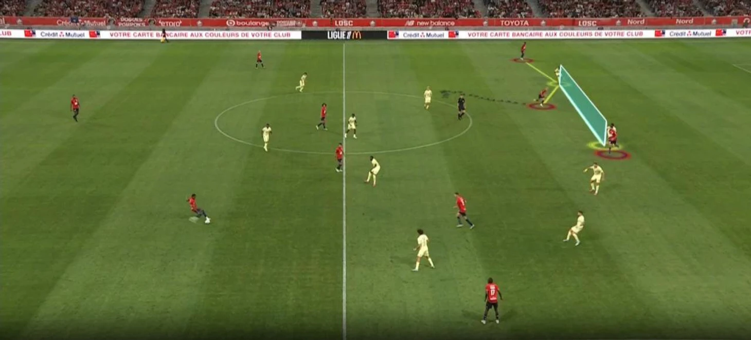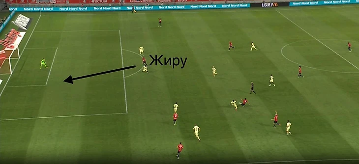 Вот еще великолепная атака «Лилля». Жиру отскочил в недодачу, ушел с позиции центрфорварда – так избавился от опеки центральных защитников. Затем увидел пространство, куда нужно забегать под навес.