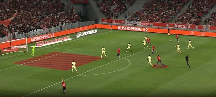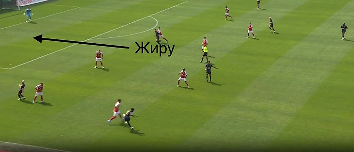 Обязательно похвалим всю организацию атаки: как только Жиру отскочил, Матиас Фернандес Пардо и Хаукон Харальдссон насытили штрафную и связали двух центральных защитников «Монако». Против Жиру ситуативно действовал опорник Денис Закария, который при навесах остается в полукруге у штрафной, чтобы контролировать подбор. Он попросту не готов к рывку Жиру в центр штрафной. Закария привык, что здесь защищается против атакующих полузащитников «Лилля», которые не бегут в штрафную в таких ситуациях. Жиру бежит.