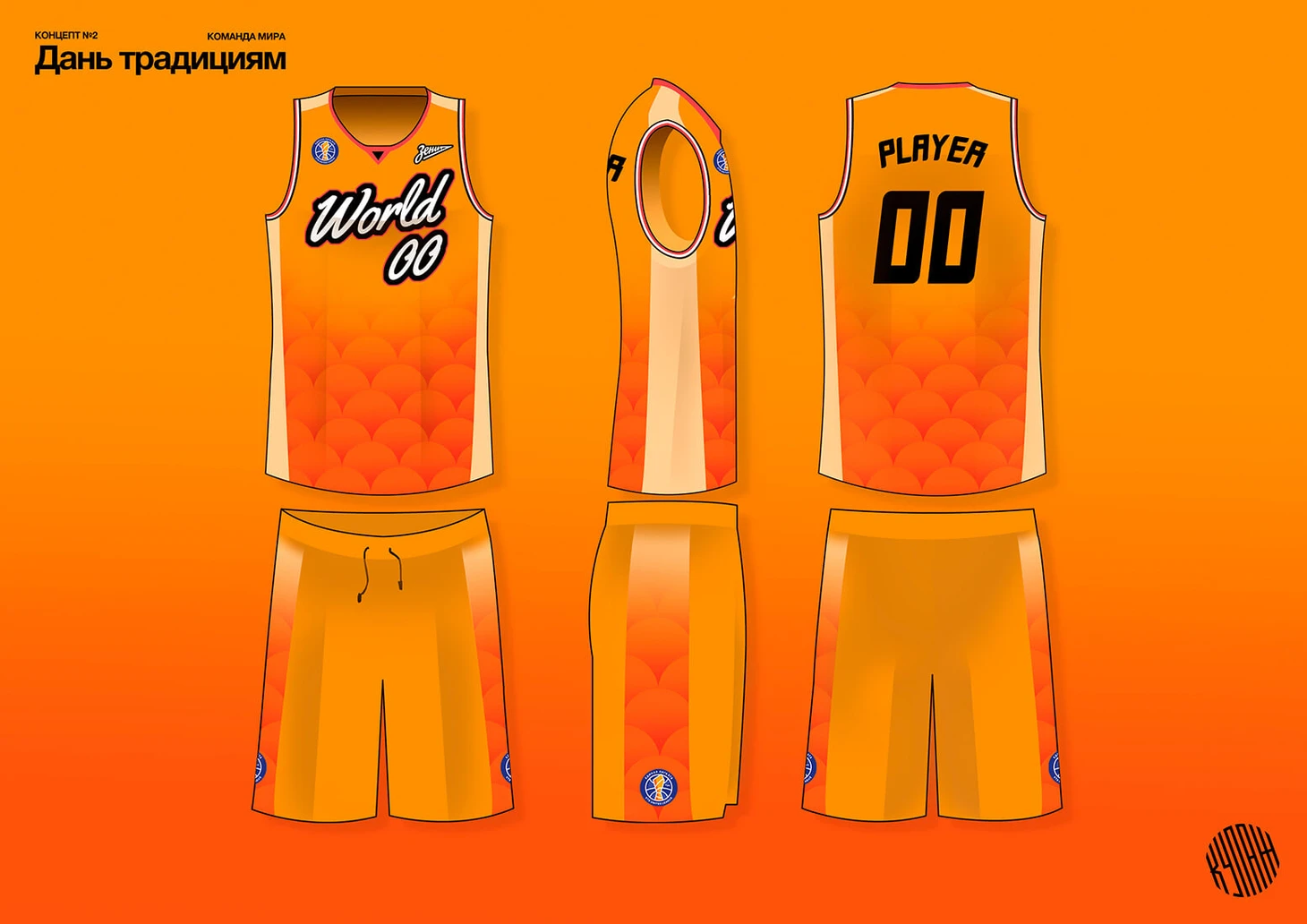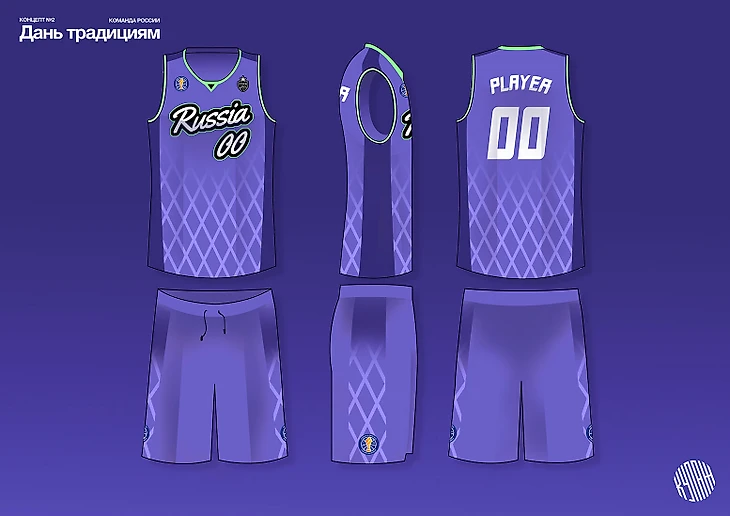 Поэтому команда России в фиолетово-лиловой форме с паттерном из баскетбольной сетки. Миру же достался паттерн из баскетбольных мячей и сочные оранжевые оттенки. Шрифты сделали с отсылками к началу 20-го века, спереди – рукописные, сзади – в стилистке модерна, который был популярен тогда.