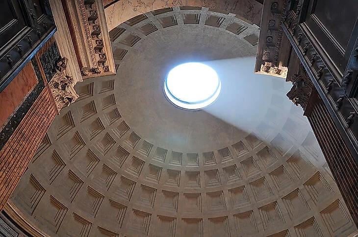 Главная особенность Пантеона – там нет окон. 9-метровое отверстие в центре крыши, «окулюс», единственный источник света. При строительстве его интерпретировали как небесное всевидящее око.