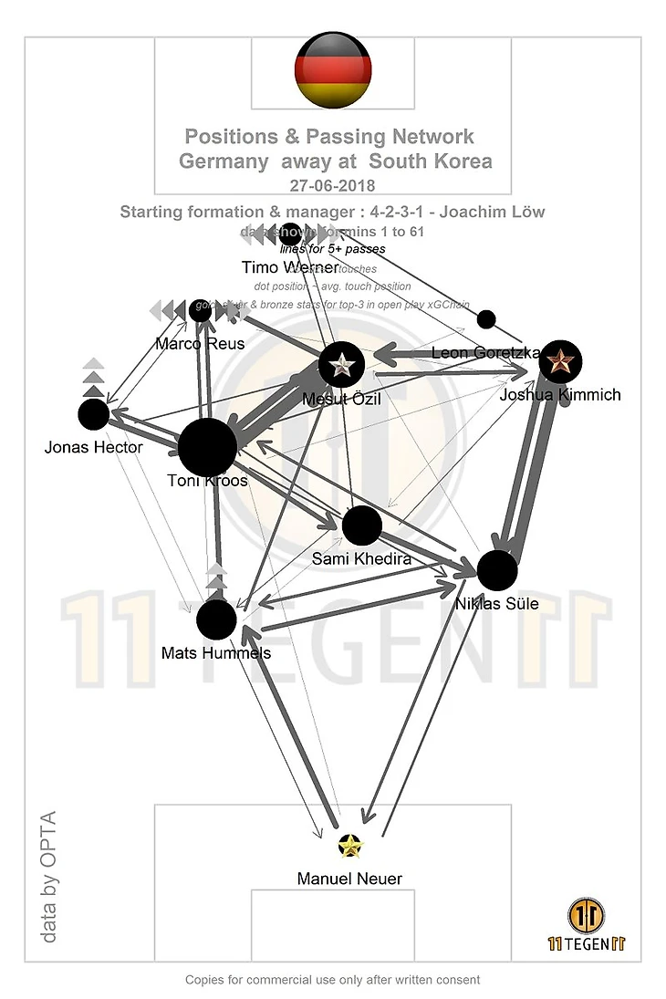 Итак, Германия - Южная Корея. Сценарий достаточно знакомый: явный фаворит, явный аутсайдер без шансов на выход из группы, фавориту надо идти вперед и выигрывать матч. И по игре немцы, как и ожидалось, разбили своего оппонента. Вот тут все можете увидеть. Мячом фавориты владели 3/4!!!! игрового времени, ударов нанесли 28 против 12, из которых лишь 4 удара были из штрафной площадки, у немцев 90% точность пасов, все на уровне фаворита встречи.