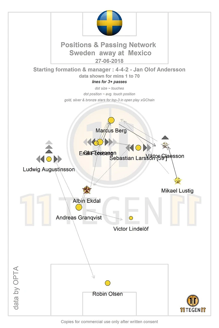 Да, у шведов всего 33% владения, мало обводок, ужасные 60% точных передач, но они, черт возьми, боролись. Вот у них было желание победить. Верховых дуэлей выиграли они больше, хоть и не намного, а вот по отборам мяча у них победа аж 21-8, это о многом говорит. Швеция мало держала мяч, но она насытила центр, посмотрите сами.